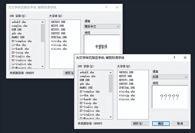 为了更加准确地进行字体替换,中望CAD 2023还为字体替换增加了预览窗口。通过预览窗口,用户在选择大字体时即可确认所选择的字体是否适配相应的语言,从而有效减少替换字体后仍然无法显示文字内容的现象。目前,该功能支持简体中文、繁体中文、日文、韩文四种语言的识别。