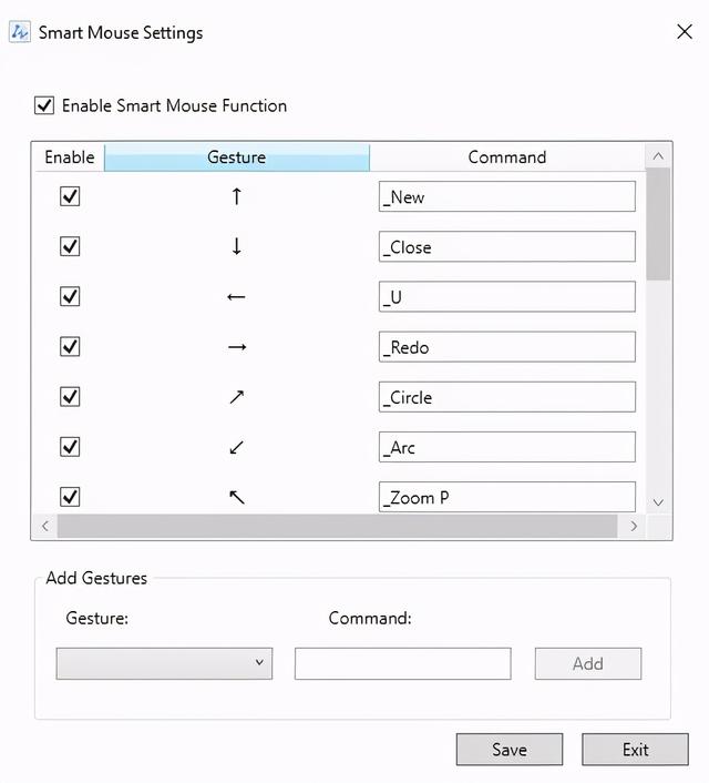 中望CAD的智能鼠标(即“手势精灵”)功能让我感到惊讶。借助该功能,我可以通过鼠标的移动轨迹或者绘制字母来调用所指定的命令。软件预置了多种常用的手势,同时还支持自定义设置,我们可以根据自身的绘图习惯修改和添加鼠标动作所触发的命令。由于帮助文档里关于此功能的表述只提到鼠标,因此我推断智能鼠标功能暂不支持触摸屏。