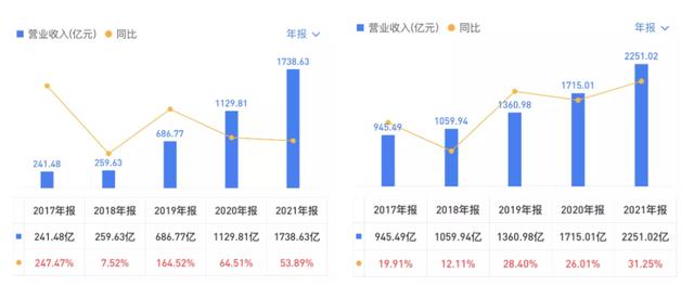 2021年,紫金矿业全年实现营业收入为2251.02亿元,同比增长31.25%,净利润156.73亿元,同比增长140.80%;相对而言,洛阳钼业营业收入1738.63亿元,同比增加53.89%,净利润为51.06亿元,同比增加119.26%。