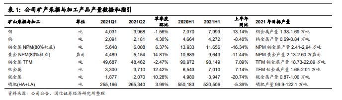 矿山业务产量方面,公司上半年钼金属产量7999吨,同比+13.14%,钨金属产量4272吨,同比-8.40%;NPM(80%权益)铜金属产量11656吨,同比-16.34%,黄金产量9643盎司,同比-11.44%;TFM铜金属产量98149吨,同比+7.89%,钴金属产量7010吨,同比+7.14%;铌金属产量3947吨,同比-20.74%,磷肥(HA+LA)产量约52万吨,同比-5.39%。