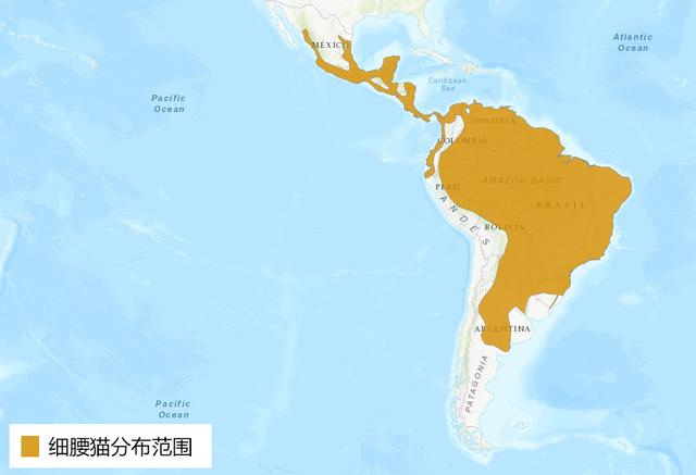 细腰猫起源于美国德克萨斯州南部及墨西哥北部沿海地区,后来向南延伸至安第斯山脉以东大部分南美洲地区,最南端到达阿根廷北部地区,其实细腰猫的分布范围跟美洲豹的历史分布范围十分类似,它们的栖息地有着很大的重叠区域。