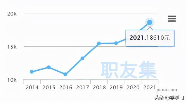从2018年起,数据分析的岗位平均薪资就有一个大幅度的增长,2020年至2021年更是有了质的突破,短短的一年中就增长了2K。