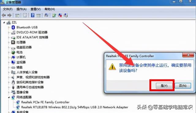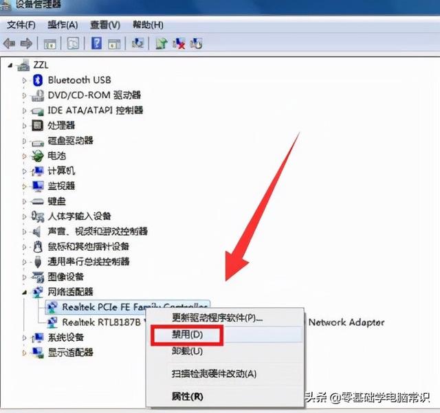 3.在设备管理器页面,您可以找到“网络适配器”。一般有两张网卡,一张有线网卡和一张无线网卡。右击有线网卡-禁用!如下图所示,将出现一个提示框,单击确定,然后右键单击开始!看重拨是否正常。