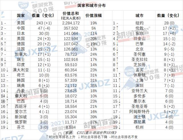 美国增加1家企业上榜,以243家排名第一;中国减少4家,以47家排名第二;其次是日本30家,英国24家,德国20家。