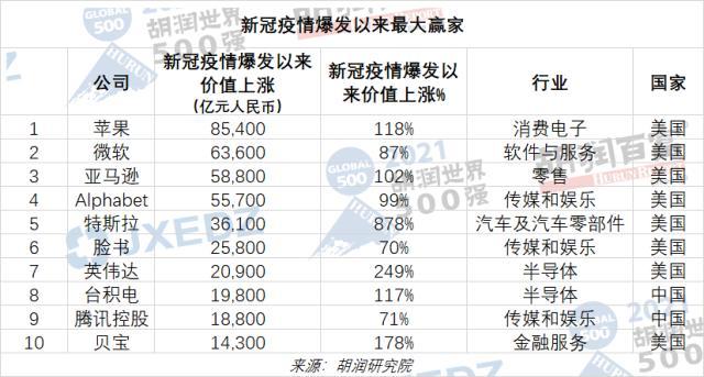 前十名总价值79万亿元,比去年增长13%,占今年“胡润世界500强”总价值的21%。
