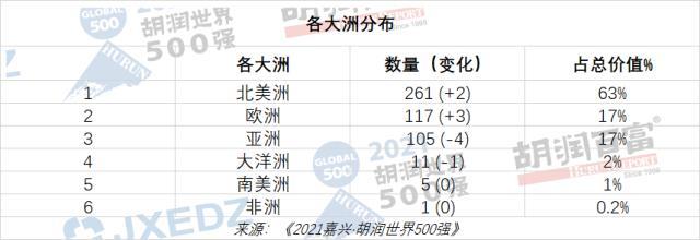 从各大洲来看,北美以261家企业领先;其次是欧洲,增加3家,至117家;亚洲减少4家,至105家。非洲只有1家企业上榜。
