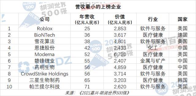 有151家上榜企业年营收低于100亿美元。8家上榜企业年营收不超过10亿美元,其中3家来自中国。