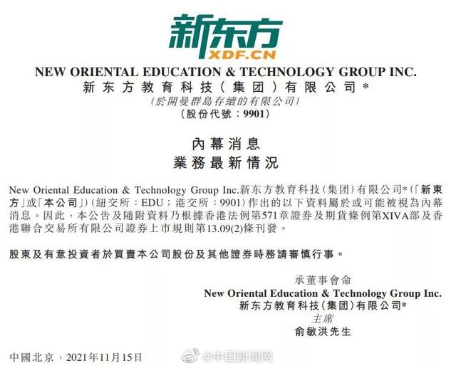 15日,新东方发布公告称,新东方计划于2021年底前全国所有学习中心不再向幼儿园至九年级学生提供学科相关培训服务(“K-9学科类培训服务”)。新东方会将其重心及资源转向与K-9学科类培训服务无关的教育产品及服务,如备考课程、成人语言培训课程及教材,并将继续开拓新业务机会及增长举措。