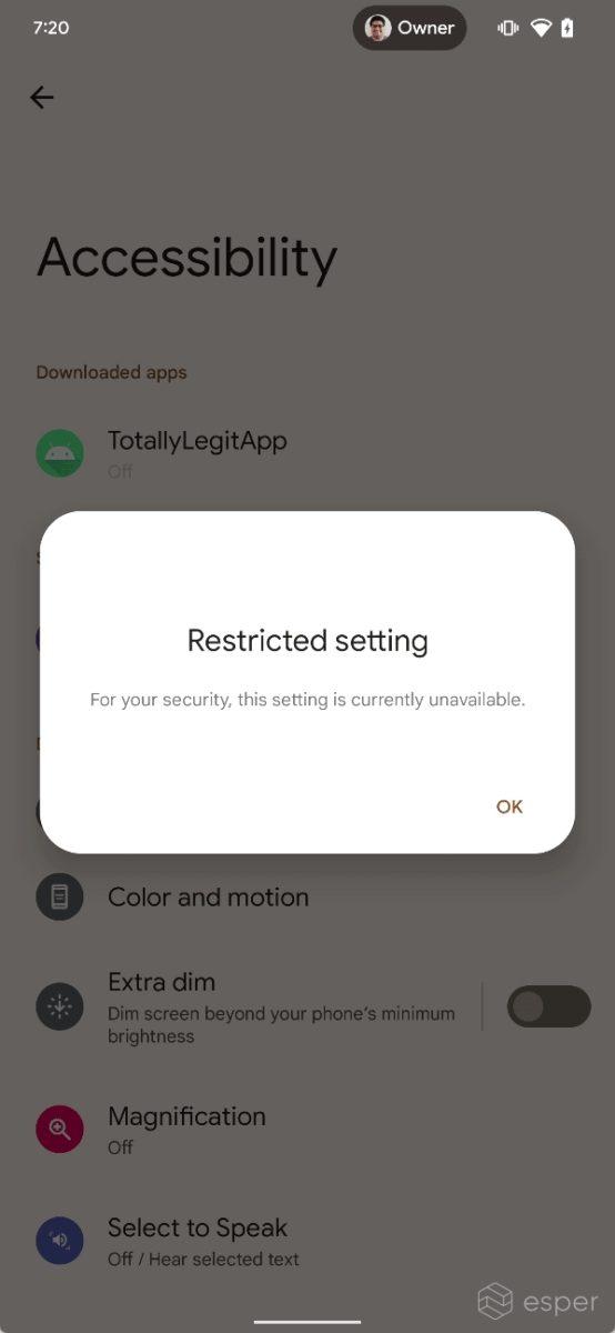 最后,Google 向 Esper表示,Android 13 可能会阻止用户向侧载应用授予相关访问权限。
