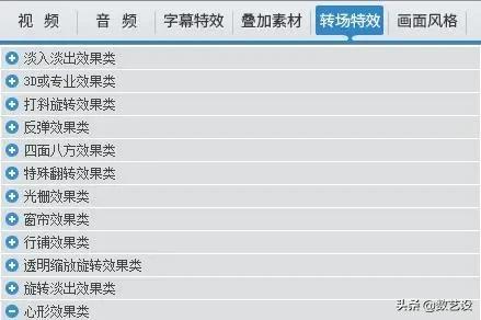 爱剪辑支持编辑多种视频及音频格式,内置大片级的文字特效,有多达上百种专业风格效果,并且囊括各种动态或静态特效技术,以及画面修复与调整方案。在视频编辑界面中,单击任意效果即可轻松将其添加到项目。其大量高质量3D和其他专业的高级切换特效,如图所示,能让视频更具动感且与众不同。