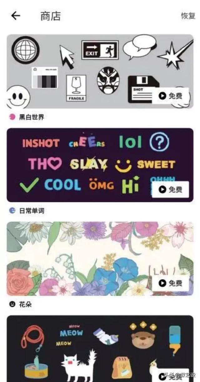 InShot软件为用户提供了大量动画贴纸,并且大多数都可以免费使用,如图所示,对于经常制作Vlog视频的人来说,贴纸素材是必不可少的。