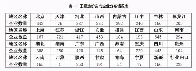 此外,根据住建部最近的一份《2019年工程造价咨询统计公报》显示,截止2019年末,全国共有8194家工程造价咨询企业参加了统计。在地区分布上,可以看出各省的工程造价咨询企业数量: