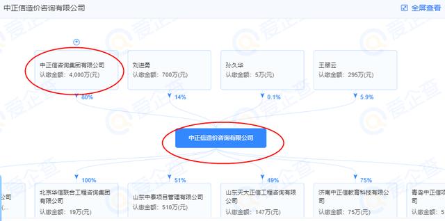 那“中正信造价咨询有限公司”和“中正信咨询集团有限公司”是不是就没关系了呢?据爱企查显示,中正信咨询集团有限公司认缴4000万元,占据中正信造价咨询有限公司80%的股份,是中正信造价咨询有限公司唯一的大股东,第二大股东仅持股14%。