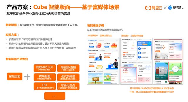 ② 产品层:基于 Cube 卡片衍生出的产品有蚂蚁动态卡片 Cube 和蚂蚁动态卡片的智能版面;基于小程序衍生出的有 Cube 高性能小程序以及 Cube 高性能小程序-智能搭建。