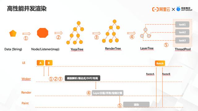 上图下方的 AB 两张卡片的上屏全过程。首先从 UI 线程触发上屏,在 worker 线程里进行初始化,完成后进入 Render 进行分层计算、手势绘制任务计算,再到 paint 线程进行多线程并发渲染,最终回到 UI 上屏。