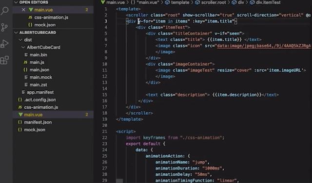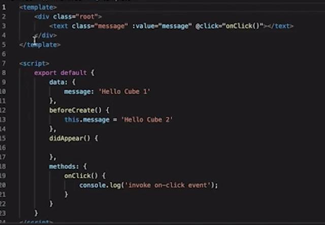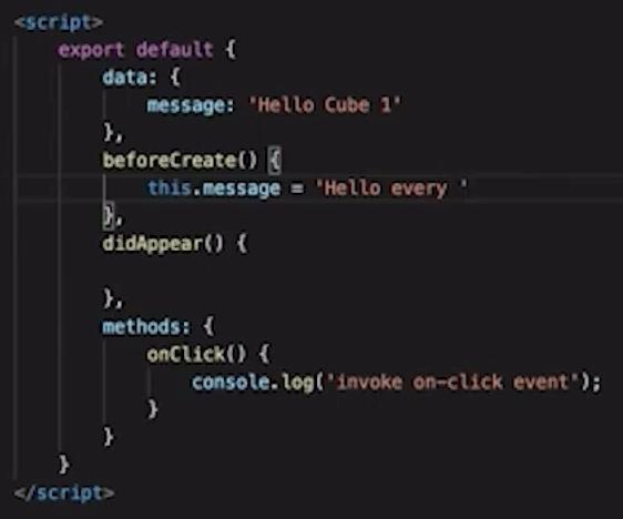 打开 main.vue,其中 template 字段包含了卡片主要的节点样式、布局等,script 包含了 JS 的变量声明、生命周期、JS 逻辑等。methods 里面可以定义 JS 方法,template 里绑定的 click 事件内定义了 onClick 方法,可以在其中写一些自己的逻辑。