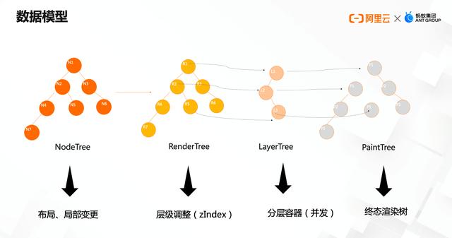 ② RenderTree:渲染的变形的数。它的层级可能会发生变化,比如模板里 zIndex 涉及到一些层级变化,做 render 树计算后最终的层级会与实际的 zIndex 能力一致,因此 render 树它会产生节点层级的调整。
