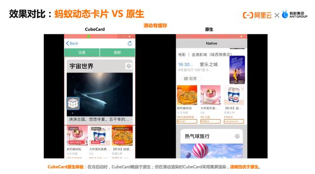 上图为蚂蚁动态卡片与原生的效果对比,整体差异并不大,卡片的性能可以媲美于原生。