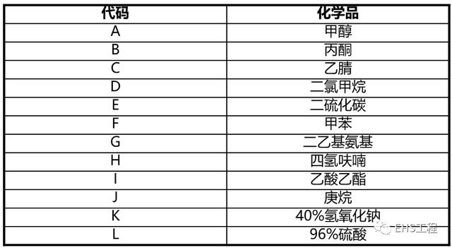 抗化学品防护测试(GB28881-2012/EN374),测试手套对抗3种化学品的能力(下表所示),手套必须达到抗化学品危害渗透的2级(大于30分钟),ABC对应下表中的化学品代码。