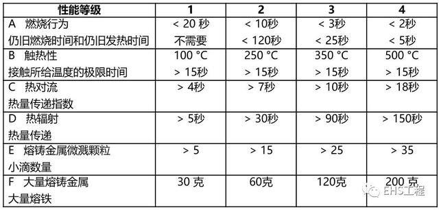 热危害防护测试(EN407),各项测试均有一个等级,测试结果以等级的形式标明( X表示测试不可行),等级越高,手套在该项测试中表现的性能就越好。
