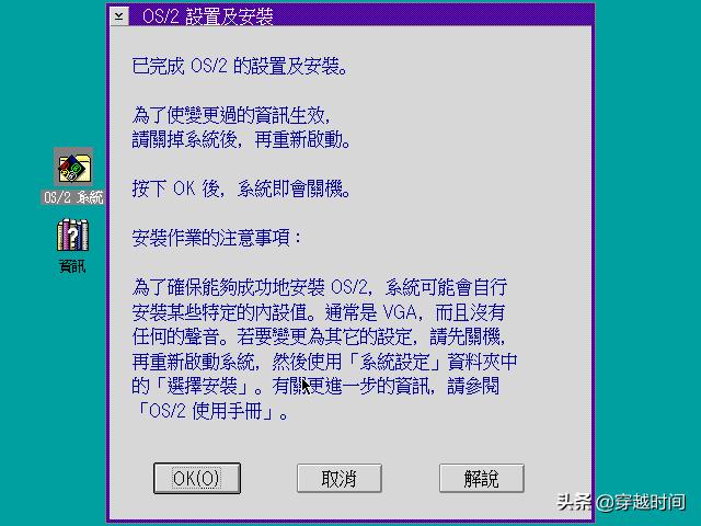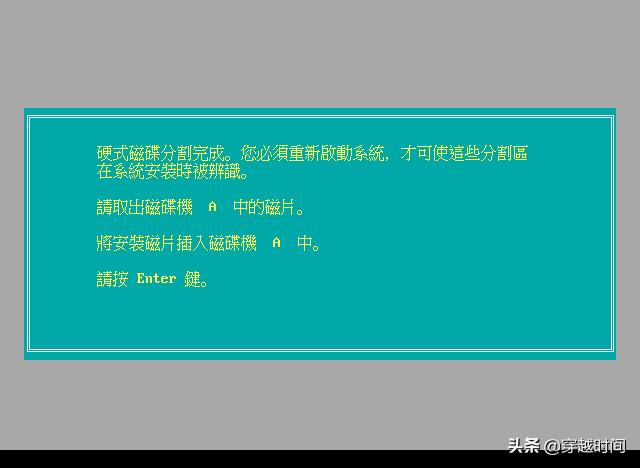 简易安装会自动为OS/2创建磁盘分区,这个过程几乎是瞬间完成的,这时,安装程序会以青底黄字给出提示,我们重新插入安装启动盘,然后重启。