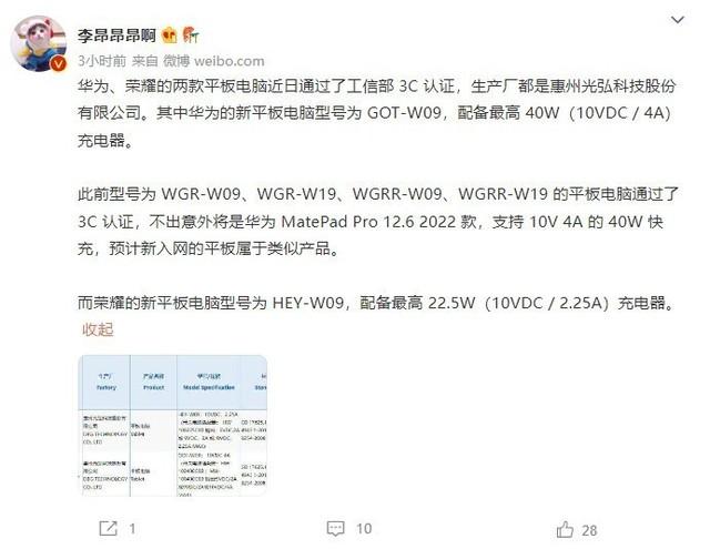 今日,数码博主@李昂昂昂啊爆料,华为、荣耀的两款平板电脑近日通过了工信部 3C 认证,生产厂都是惠州光弘科技股份有限公司。其中华为的新平板电脑型号为 GOT-W09,配备最高 40W(10VDC / 4A)充电器。