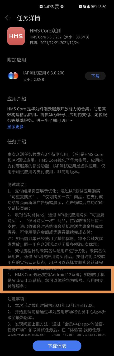 4、HMS Core 现已支持 Android 12 系统; 如您的手机是 Android 12 系统,你可以体验华为帐号、应用内支付等服务;
