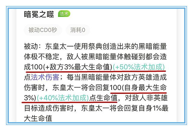 换言之,就是东皇的法强越高,黑暗能量的伤害和回复效果就越强;目标双方的血量越高,东皇的伤害和回复效果就越好。