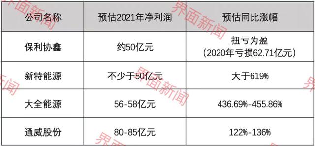 据界面新闻统计,四家企业的全年净利润,合计最少可达236亿元。其中,通威股份净利润数额最高,达80亿-85亿元,同比增长超1.2倍;其次是大全能源,净利达56亿-58亿元,同比增长超4倍。