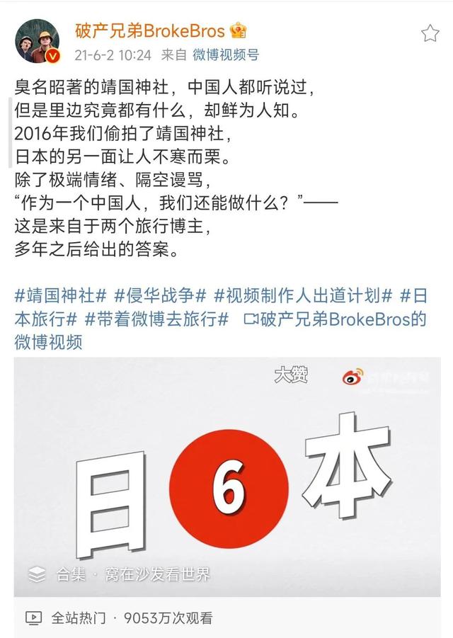 这条视频的名字叫《我们偷拍了靖国神社》,在视频里,他们为观众揭露了靖国神社的真实面貌,并运用理性克制的表达,引发了大众更深层次的关于历史真相及文化自信的思考。视频一经发布迅速引起关注,不仅登上了微博视频热榜当天的全站第一,更获得了超过9000万的播放量,转发量也高达43万。