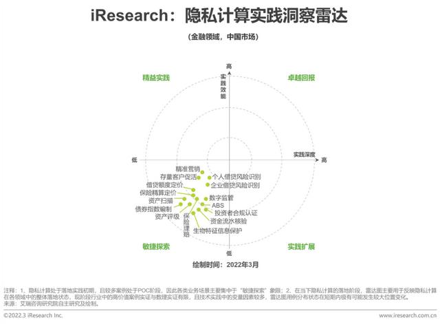3)分析师认为风控、营销大类场景中至少分别会有1~3个细分场景用例进入“实践扩展”象限,这些细分场景将在技术性能允许的范围内,扩大业务实践范围。