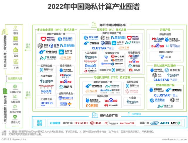 多数厂商布局了“MPC、FL、TEE”中的多项技术方案,且各具优势。艾瑞研究团队和产业专家团认为,应该鼓励企业进行多元化技术方案创新探索,因此产业图谱不对企业进行苛刻的“唯一性定位(每个企业仅展示自身「最优」的技术方案)”,而是采取了“最大兼容性”原则。但是行业用户在进行厂商选择时,需要考查并明确各厂商的具体技术优势所在。
