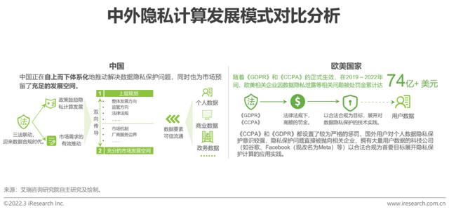 产学研协同的高效发展:中国的隐私计算在数据要素安全流通的市场需求和政策需求的推动下迎来发展契机,金融、政务、运营商等领域均在积极展开隐私计算基础平台建设,并逐渐开始在应用层展开场景实践。在产业需求的推动下,隐私计算跨平台互联互通建设、国产芯片厂商对可信硬件的研发、软硬一体机产品创新等均在如火如荼地开展。基于此,技术服务商还在探索基于数据运营商业模式下的更大市场机会。整体上,中国隐私计算在产、学、研的协同促进下取得了高效的发展。