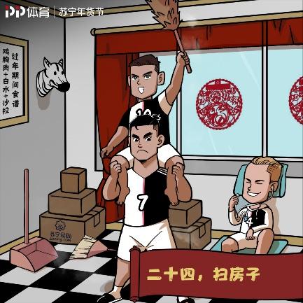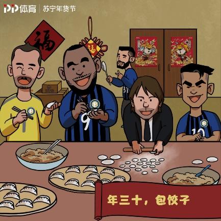 大年三十,辞旧迎新,很多家庭都会包饺子,国际米兰众将就聚在一起包得热火朝天。门上贴着苏宁易购的主题年画,更是让整张海报的节日气氛更加浓厚。
