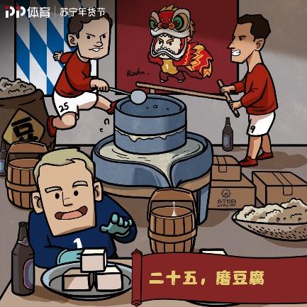 腊月二十五的时候,家家户户都会赶紧磨出好几盘豆腐。拜仁的三位球星也正忙得不可开交,莱万多夫斯基与穆勒在磨盘上辛辛苦苦地工。看来"来碗豆腐斯基"真的对豆腐情有独钟呀!而门将诺伊尔,却早就对磨好了的豆腐垂涎三尺。
