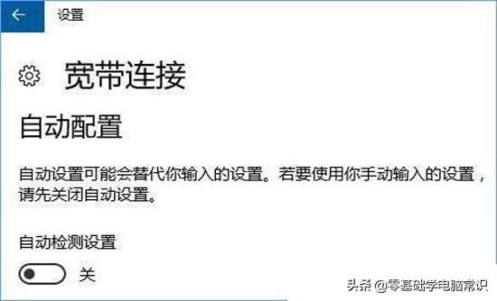 4.打开【宽带连接高级设置界面】,我们移动到下面【自动配置】(自动设置可能会替代你输入的设置。若要使用你手动输入的设置,请先关闭自动设置)下方的【自动检测】开关打开即可。
