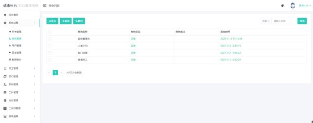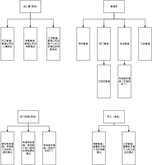 超级管理员:系统管理、用户管理(冻结等)、职称管理、部门管理(工资项)、岗位管理(考核指标管理,可指定部门)、工龄管理等。