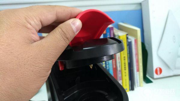 饮品机的正面醒目位置,就是它的电源开关,按压式的设计。电源下方则是产品的LOGO,汤金色的字体,很是醒目。红黑色的搭配,从这里看也是非常协调的,但是纯塑料的设计,总感觉拉低了产品的颜值。