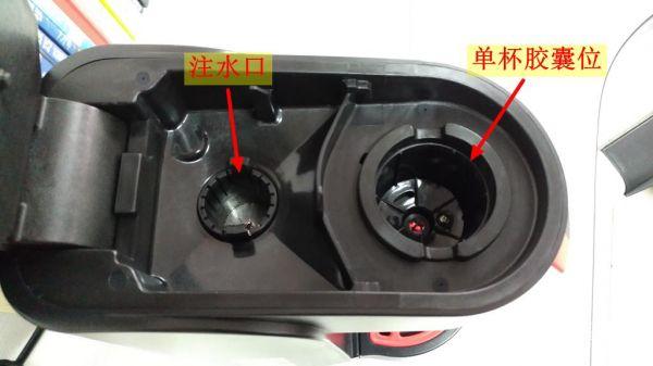 打开盖子后,就能够看到两个孔位,大一些的是用来放置单杯饮品的孔位,而小一些的则是注水口。饮品机的水箱最大可以装入340ml的水,这个水量足够好几杯咖啡的量了。