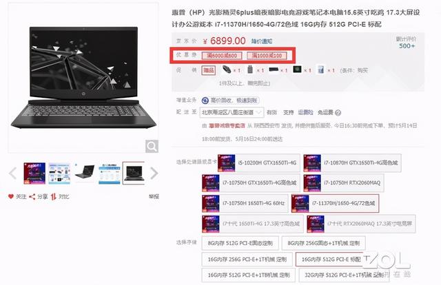 本次推荐机型配置为:英特尔酷睿i7-11370H处理器、16GB内存、512GB SSD以及GTX 1650 4G显存独立显卡,近期这款产品参考售价为6899元。京东购机可领取满6000减600优惠券,最终只要6299元即可买到这款产品。