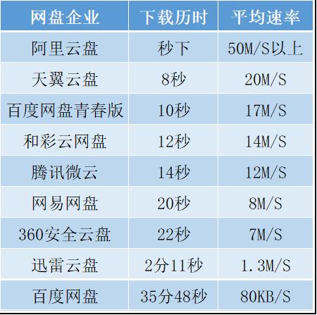 结果显示,表现较好的是阿里云盘,几乎是秒传秒下,下载速率可达50M/S以上;天翼云盘、百度网盘青春版、和彩云、腾讯微云用时15S以内,平均下载速率超10M/S;网易网盘、360安全云盘则在20S左右,平均下载速率在7-8M/S;迅雷云盘表现较差,花时两分钟多,平均速率仅有1.3M/S,和阿里云盘速率相差约40倍。