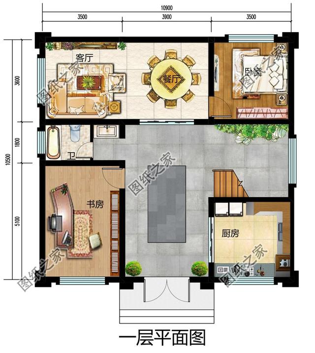 一层户型:客厅、餐厅、厨房、卫生间、主卧、书房、庭院;