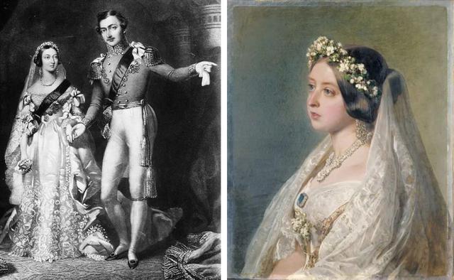 左:1840年维多利亚女王与阿尔伯特婚礼当天的版画。右:年轻的维多利亚女王新娘肖像。二人的婚礼在信息并不畅通的当时仍然引起了全世界的关注,白色婚纱也是从这里开始变成西式婚礼的传统。