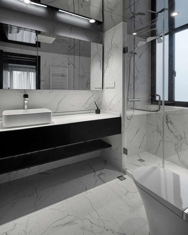卫生间有点酒店式格调,高低比较低,因此用了镜面扣板,扩大视觉空间,减缓层高压抑感。挡水条直接人工现场切割铺贴,效果更佳统一美观。