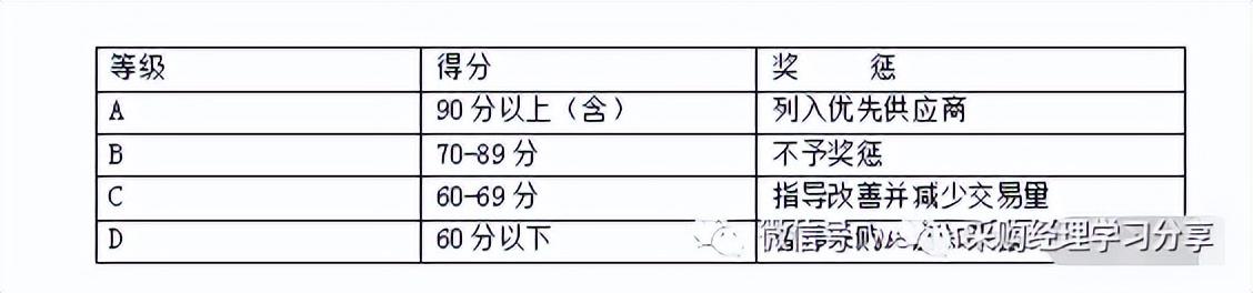 ②考核方法实行供应商评分分级制度,评分满分为100分,共分为A级、B级、C级、D级四个级别。