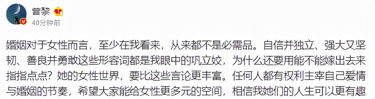 曾黎也曾在公共平台发布了自己的观点:婚姻对于女性而言,至少在我看来,从来都不是必需品。