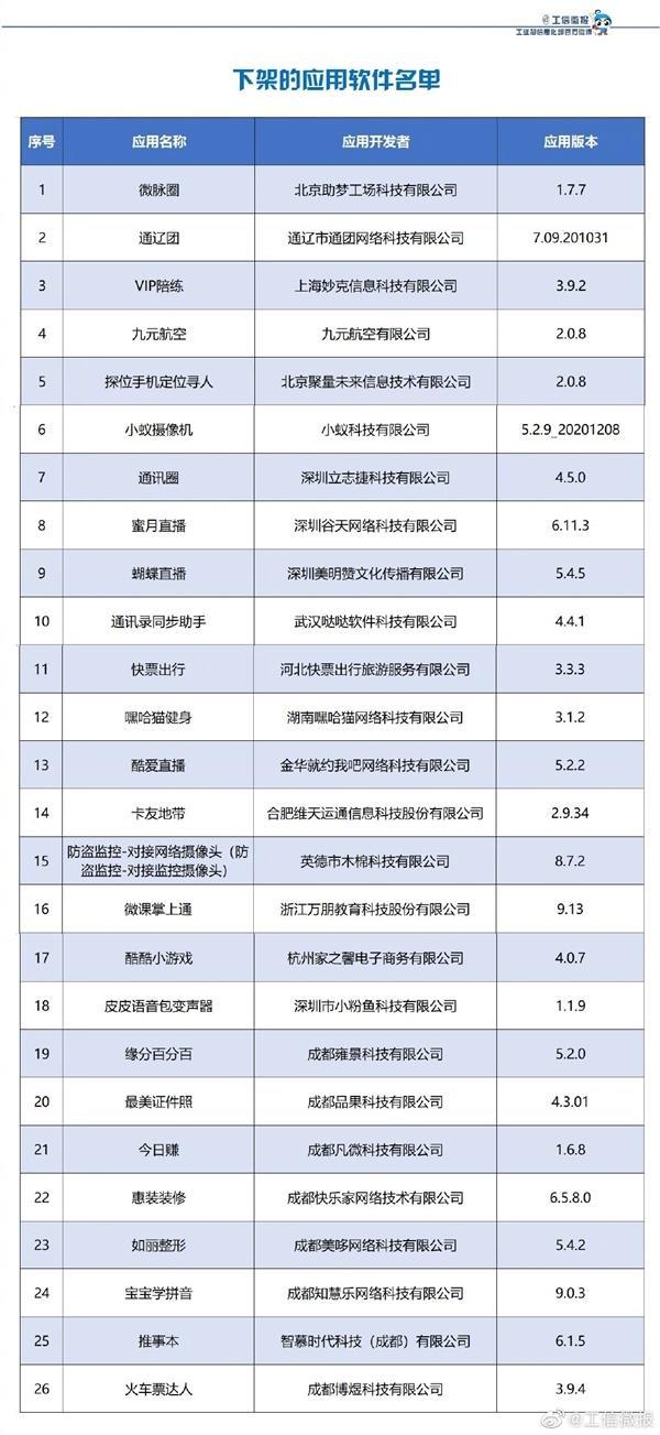 12月16日,工信部发布《关于下架侵害用户权益APP名单的通报》,要求相关应用商店下架微脉圈、VIP陪练、九元航空、蜜月直播、小蚁摄像机、微课掌上通等26款侵害用户权益APP。
