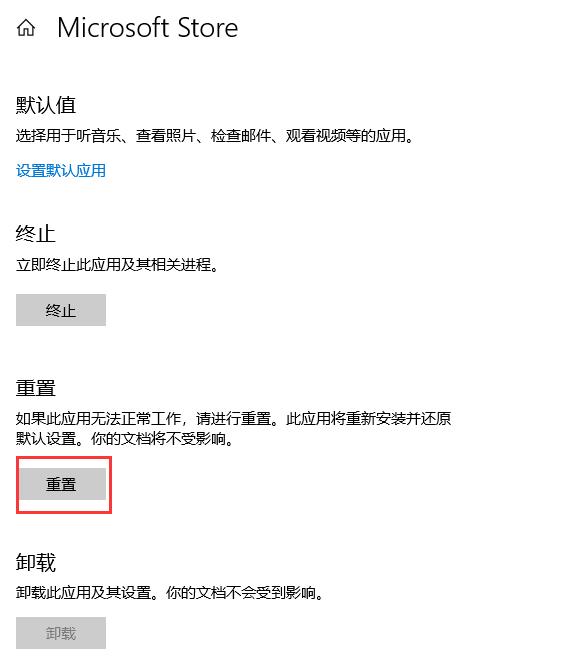打开 设置>应用>应用和功能>在左边的列表中找到应用商店选中>高级选项>重置