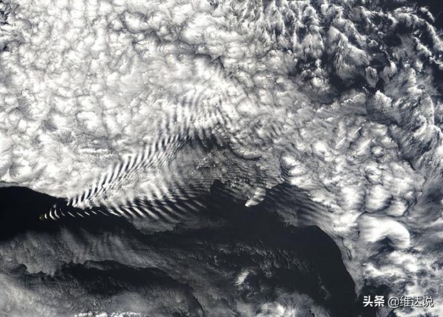 气流经过阿姆斯特丹岛,云团图案不断交错,形成类似船后波浪的波浪云。图由2005年“土星”卫星拍摄。