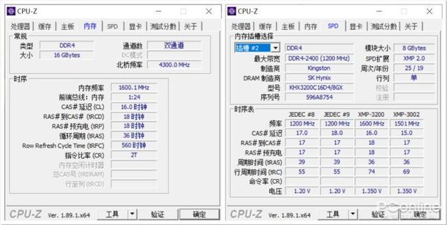 通过查看CPU-Z中的SPD选项页,我们可以看到骇客神条Fury DDR4内存的默认频率2400MHz,在XMP的加持下可以实现3000MHz以及3200MHz的频率。而在内存页面也可以到其工作在3200MHz频率参数,如电压为1.35V,时序为16-18-18-36,表现也十分不错。